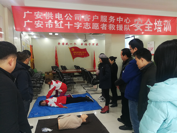 近日,广安市红十字会志愿者救援队到广安电业公司分批对公司客户服务中心75名员工传授应急救护知识。救援队师资深入浅出的知识讲解和现场演示的教学方法,深受员工们欢迎,认真听课,积极操作练习。