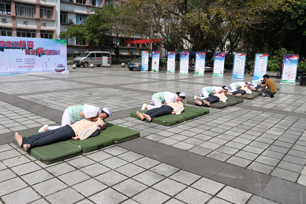 红十字志愿者、县人民医院医护人员为同学们演示应急救护技能技巧