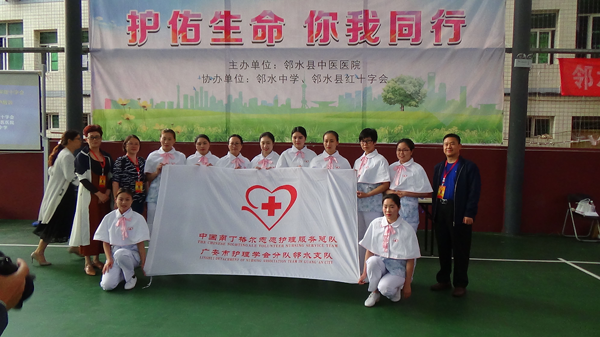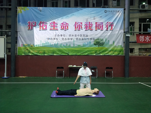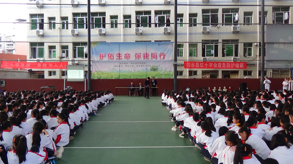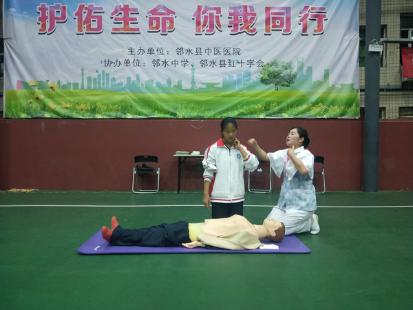 邻水县红十字会、南丁格尔志愿护理服务广安邻水支队走进邻水中学 邻水县红十字会、县中医院医护人员对在校学生进行应急救护知识培训 邻水县红十字志愿者、县中医院医护人员为同学们演示应急救护技能技巧