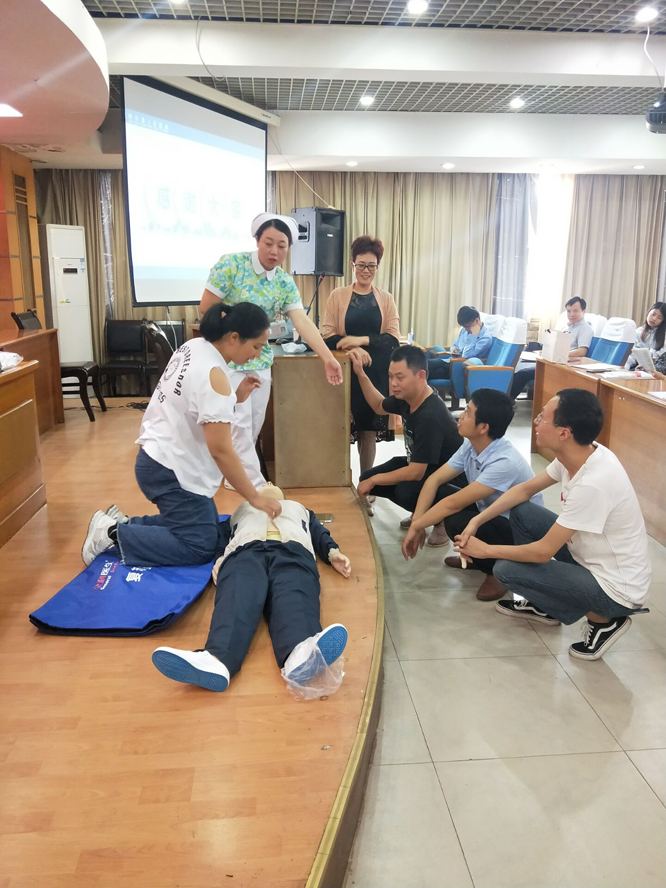县红十字会干部讲解红十字运动基本知识 南丁格尔志愿护理广安分队邻水支队志愿者、县人民医院护士长张俊讲解应急救护知识。 现场演示、指导学员进行心肺复苏操作技能练习。 现场演示、指导学员进行心肺复苏操作技能练习。