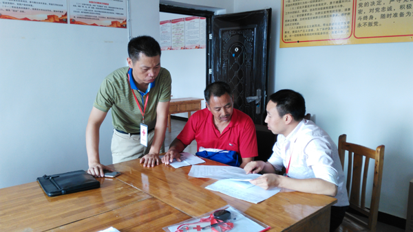 将《小天使基金彩票公益金项目资助告知书》送到武胜县龙玉乡玉子溪村3组白血病患者李博家中,在李博家旁的村委会活动室指导李博的爷爷李良平(中)准备资助款拨付资料。