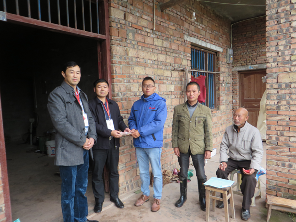 到岳池县苟角镇风门坳村3组重病患者蒋池云(左二)家中调查了解情况,帮助完善求助资料。