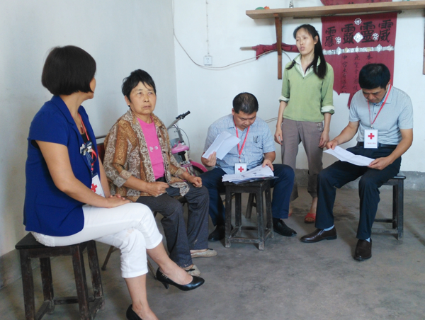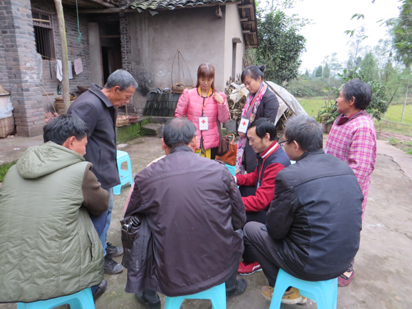 市县红十字会干部和志愿者在广安区龙台镇白桥村进行村民访谈。