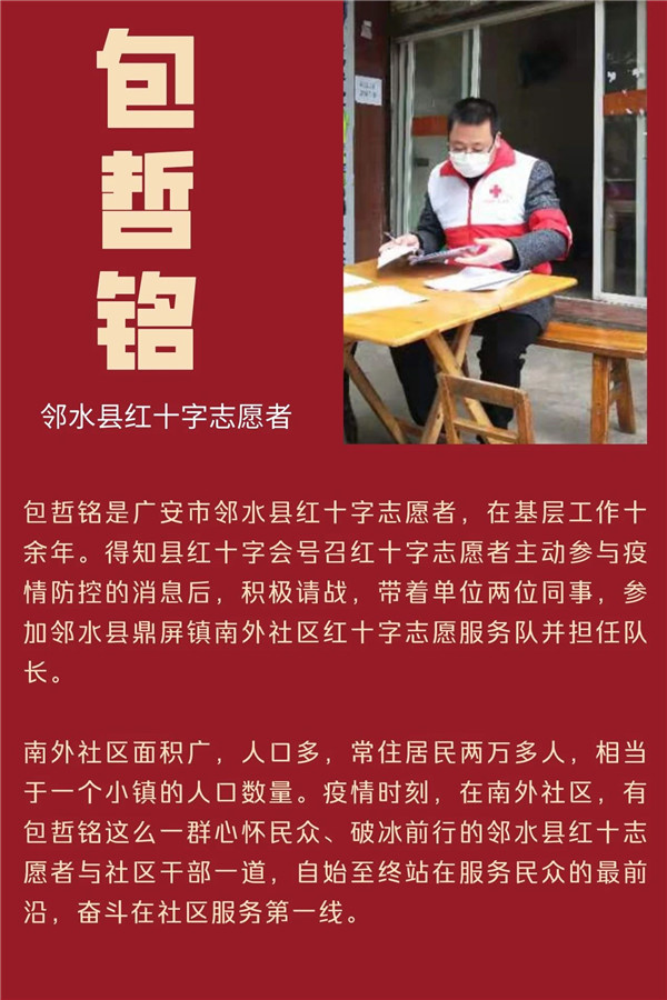 是他们,是每一位包哲铭这样的红十字志愿者,默默地坚守自己平凡的岗位,在抗击疫情的同时,用红十字人的责任、使命和担当传递着“人道、博爱、奉献”精神。