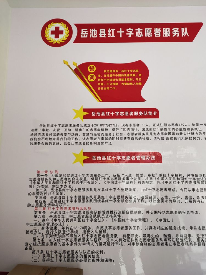 “人道·博爱·奉献”是岳池县红十字志愿者服务队的宗旨。为更好地开展团队工作,为志愿者们提供便捷服务,宣传志愿者精神,服务于人民大众,岳池县红十字志愿者服务队办公室经过一个月紧密锣鼓的筹备,终于在2020年7月20日投入使用啦!办公场地的维修,办公用具的购置与安放,制度的完善与上墙,标语的制作与使用,没有一样不渗透着我们队长张贵华、常务副队长李奎、陈国彬和各位志愿者的心血。