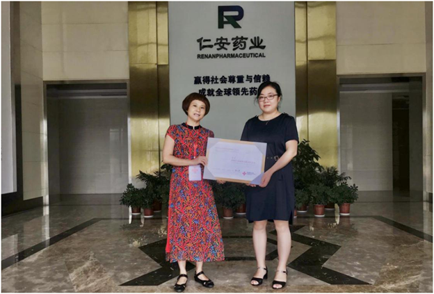 市红十字会到四川仁安药业有限责任公司送荣誉奖牌。
