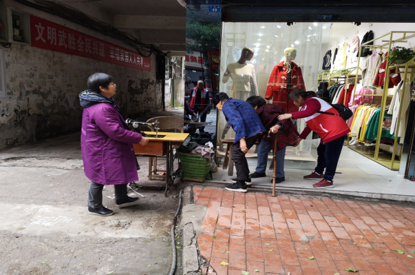 志愿者劝导菜农到指定位置卖菜