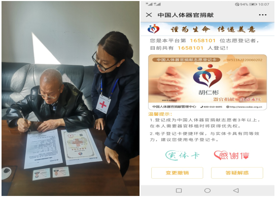 “太好了,今天终于了却了我20多年来的一个心愿!作为一名老党员,能够在百年后继续做出最后的奉献,把我的一切献给党和人民,我这一生就圆满了。”胡仁彬老大爷拿到中国人体器官捐献志愿登记证书后如是说。