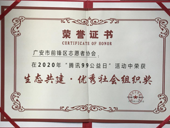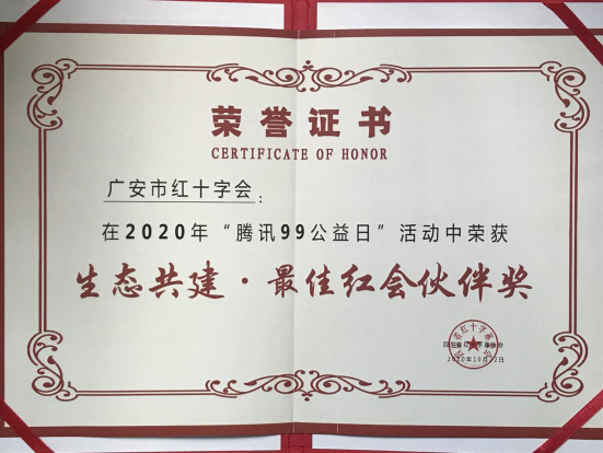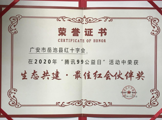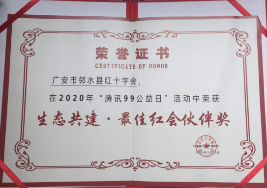 10月22日,四川省2020年“腾讯99公益日”总结表彰会在成都举行。市红十字会、邻水县红十字会、岳池县红十字会荣获“生态共建·最佳红会伙伴奖”,前锋区志愿者协会荣获“生态共建·优秀社会组织奖”。