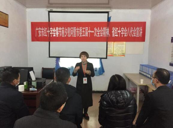 广安市红十字会常务副会长杨江华宣讲了市委五届十一次全会精暨省红十字会第八次会员代表大会精神,向干部群众介绍了红十字运动、“三救三献”、疫情防控等相关知识