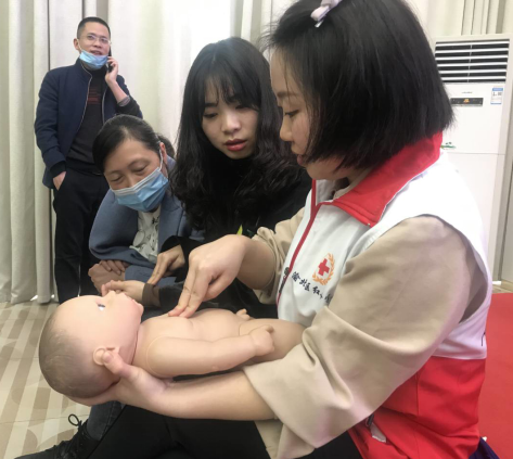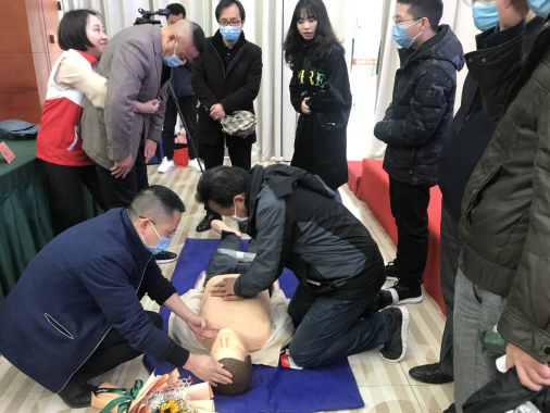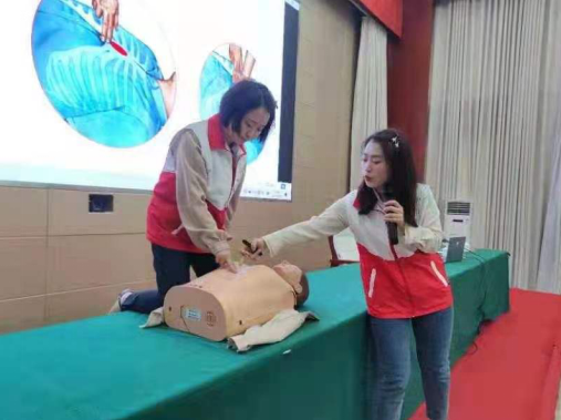 两位老师一边介绍理论和操作要领,一边进行操作演示,向学员们耐心细致地讲解了心肺复苏术、自动体外除颤仪操作技能、气道异物梗阻、创伤包扎等急救护知识。