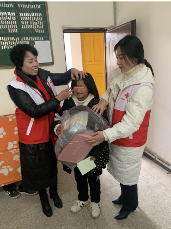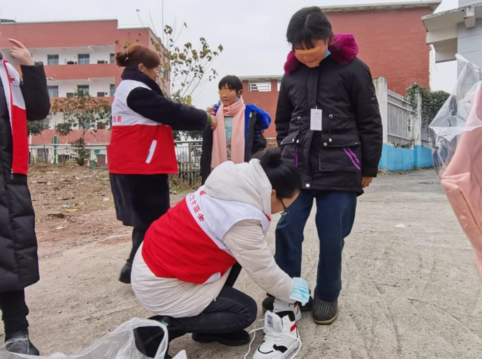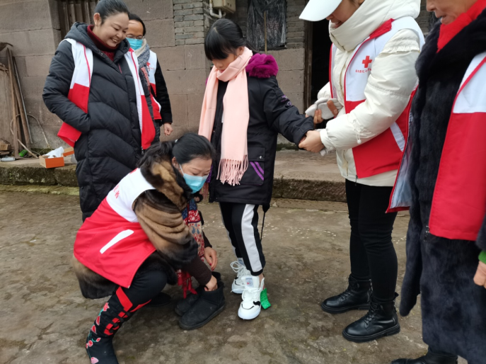 2022年元旦假期,岳池县红十字志愿者服务队开展“新年新衣 送温暖”活动,为贫困学生送去过年的新衣服、围巾、鞋子、手套等衣物,希望他们过一个温暖、愉快的节日,嘱咐孩子们好好学习,孝敬长辈,长大后报效国家。