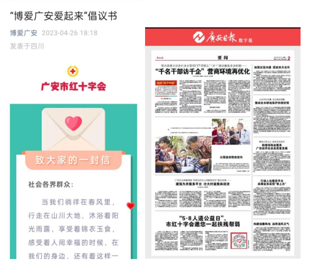 市红十字会通过微信公众号、广安日报向社会发出倡仪。