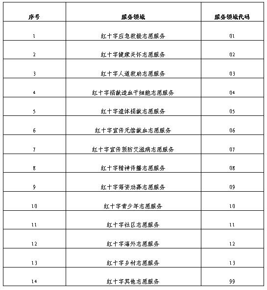根据《中国红十字志愿服务管理办法》相关规定,现对红十字志愿者服务领域编码规定如下: